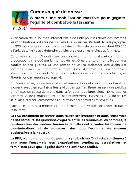 La FSU est vigilante et déterminée à bloquer les mauvais coups, à gagner de nouveaux droits en matière de santé au travail, d’égalité professionnelle entre les femmes et les hommes, de conciliation entre vie privée et vie professionnelle, et à obtenir l’augmentation des rémunérations ! La FSU agit dans les instances et rassemble aussi dans les luttes : elle appelle à construire la réponse collective pour gagner l’égalité salariale, au travail et dans toute la société pour toutes les femmes, notamment en participant à la grève féministe du 8 mars.