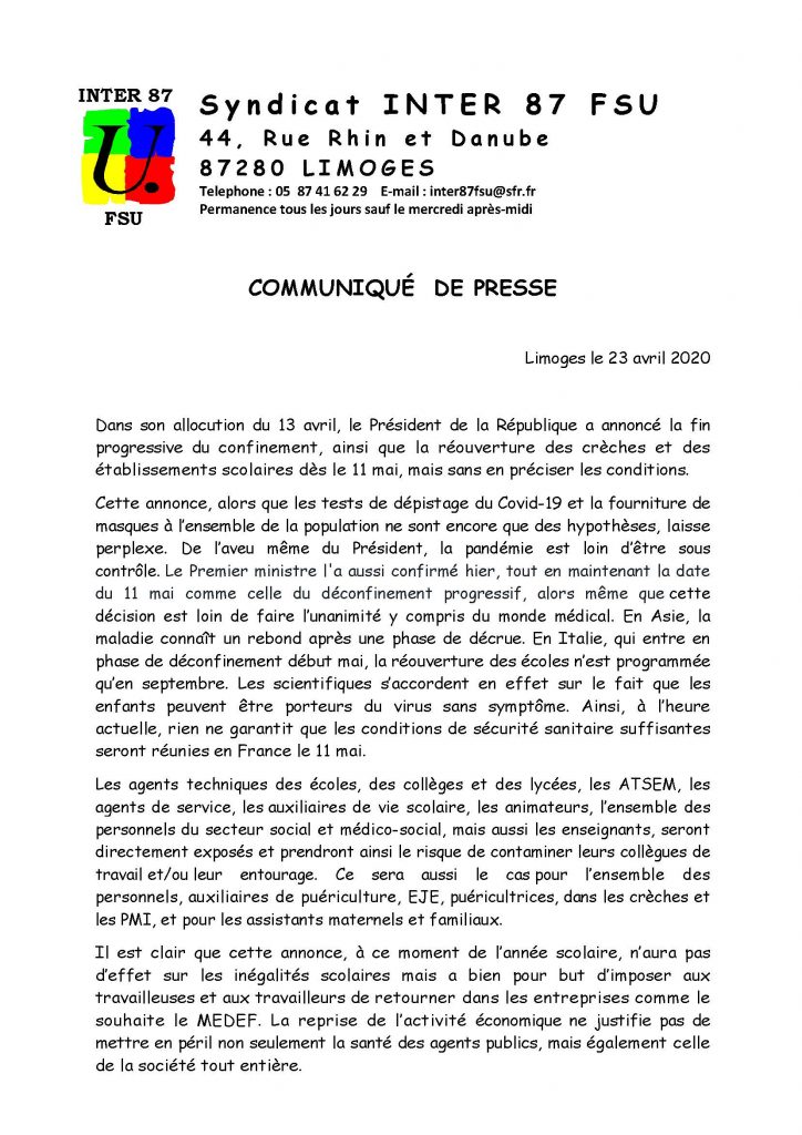 INTER87 FSU prendra toutes ses responsabilités en tant qu’organisation syndicale pour protéger la santé des personnels et des usagers.