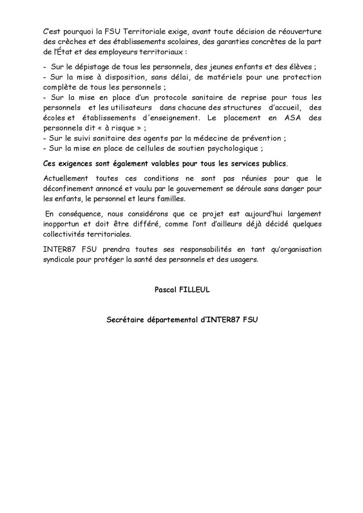 C’est pourquoi la FSU Territoriale exige, avant toute décision de réouverture des crèches et des établissements scolaires, des garanties concrètes de la part de l’État et des employeurs territoriaux :