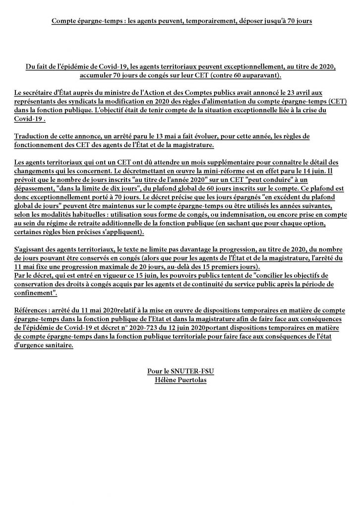 Posted in Législation - FAQ Compte épargne-temps : les agents peuvent, temporairement, déposer jusqu’à 70 jours LA FSU TERRITORIALE 16 juin 2020 cet-70-joursTélécharger cet-70-jours Author: LA FSU TERRITORIALE