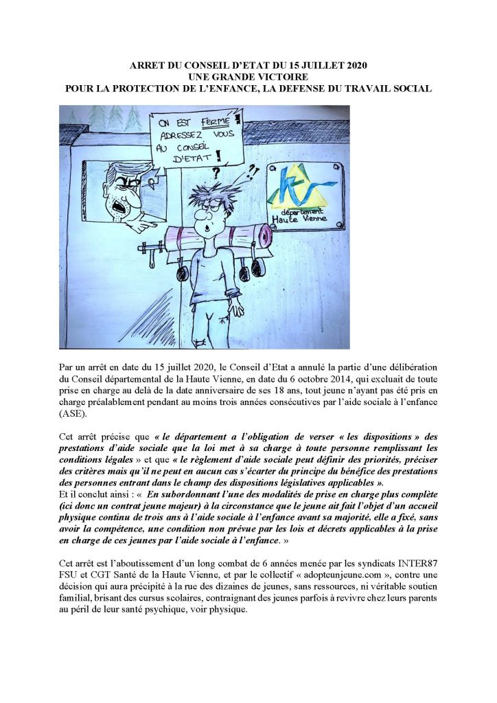 Par un arrêt en date du 15 juillet 2020, le Conseil d’Etat a annulé la partie d’une délibération du Conseil départemental de la Haute Vienne, en date du 6 octobre 2014, qui excluait de toute prise en charge au delà de la date anniversaire de ses 18 ans, tout jeune n’ayant pas été pris en charge préalablement pendant au moins trois années consécutives par l’aide sociale à l’enfance (ASE).