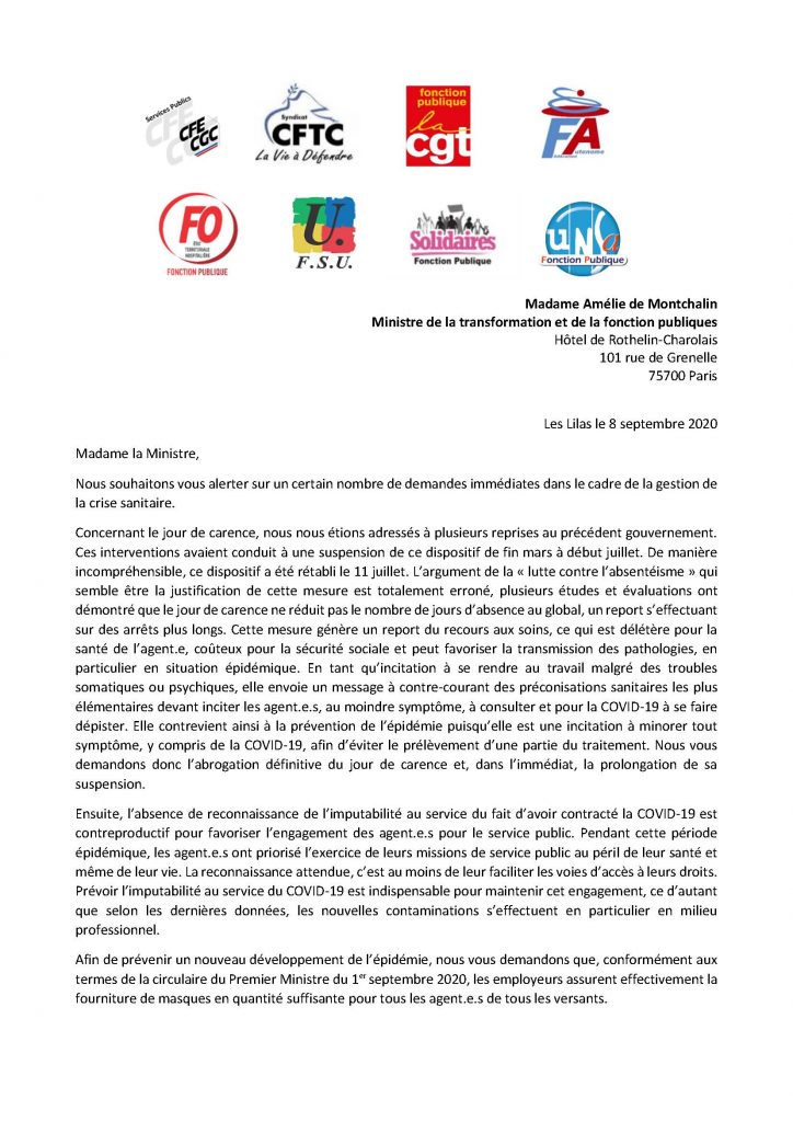 Concernant le jour de carence, nous nous étions adressés à plusieurs reprises au précédent gouvernement. Ces interventions avaient conduit à une suspension de ce dispositif de fin mars à début juillet. De manière incompréhensible, ce dispositif a été rétabli le 11 juillet. L’argument de la «lutte contre l’absentéisme» qui semble être la justification de cette mesure est totalement erroné, plusieurs études et évaluations ont démontré que le jour de carence ne réduit pas le nombre de jours d’absence au global, un report s’effectuant sur des arrêts plus longs. Cette mesure génère un report du recours aux soins, ce qui est délétère pour la santé de l’agent.e, coûteux pour la sécurité sociale et peut favoriser la transmission des pathologies, en particulier en situation épidémique. En tant qu’incitation à se rendre au travail malgré des troubles somatiques ou psychiques, elle envoie un message à contre-courant des préconisations sanitaires les plus élémentaires devant inciter les agent.e.s, au moindre symptôme, à consulter et pour la COVID-19 à se faire dépister. Elle contrevient ainsi à la prévention de l’épidémie puisqu’elle est une incitation à minorer tout symptôme, y compris de la COVID-19, afin d’éviter le prélèvement d’une partie du traitement. Nous vous demandons donc l’abrogation définitive du jour de carence et, dans l’immédiat, la prolongation de sa suspension.