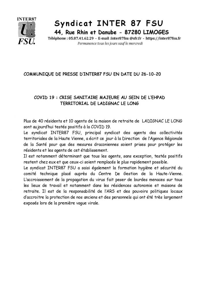 Le syndicat INTER87 FSU, principal syndicat des agents des collectivités territoriales de la Haute Vienne, a écrit ce jour à la Direction de l’Agence Régionale de la Santé pour que des mesures draconiennes soient prises pour protéger les résidents et les agents de cet établissement.