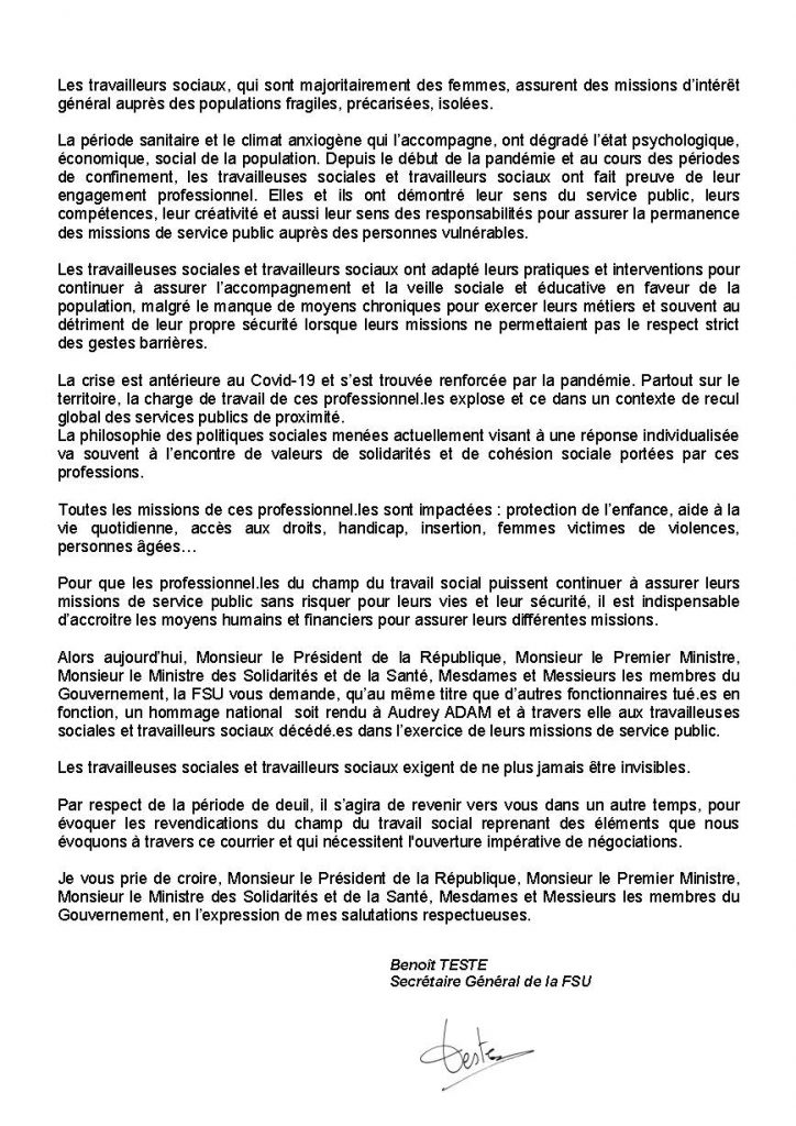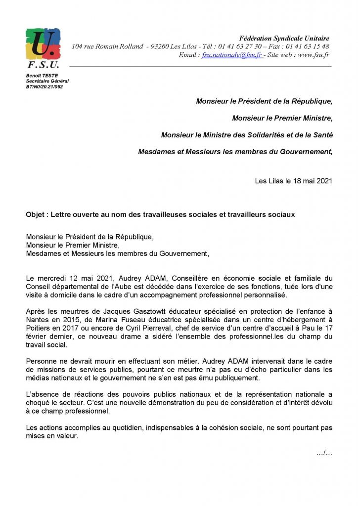 Courrier envoyé au Président de la République et aux membres du gouvernement à la suite de notre communiqué de presse d’hier suite au décès en service d’une conseillère en économie sociale et familiale. Les camarades siégeant pour la FSU au Haut Conseil du Travail Social, instance de concertation placée auprès du ministère de la santé, y sont intervenus pour exiger qu’à minima un hommage institutionnel lui soit rendu. Il s’agit d’une affaire qui secoue beaucoup les travailleuses sociales et travailleurs sociaux mais qui est ignorée par le gouvernement et ne perce pas le mur médiatique, signe de mépris contre lequel la FSU doit s’élever de toutes ses forces.
