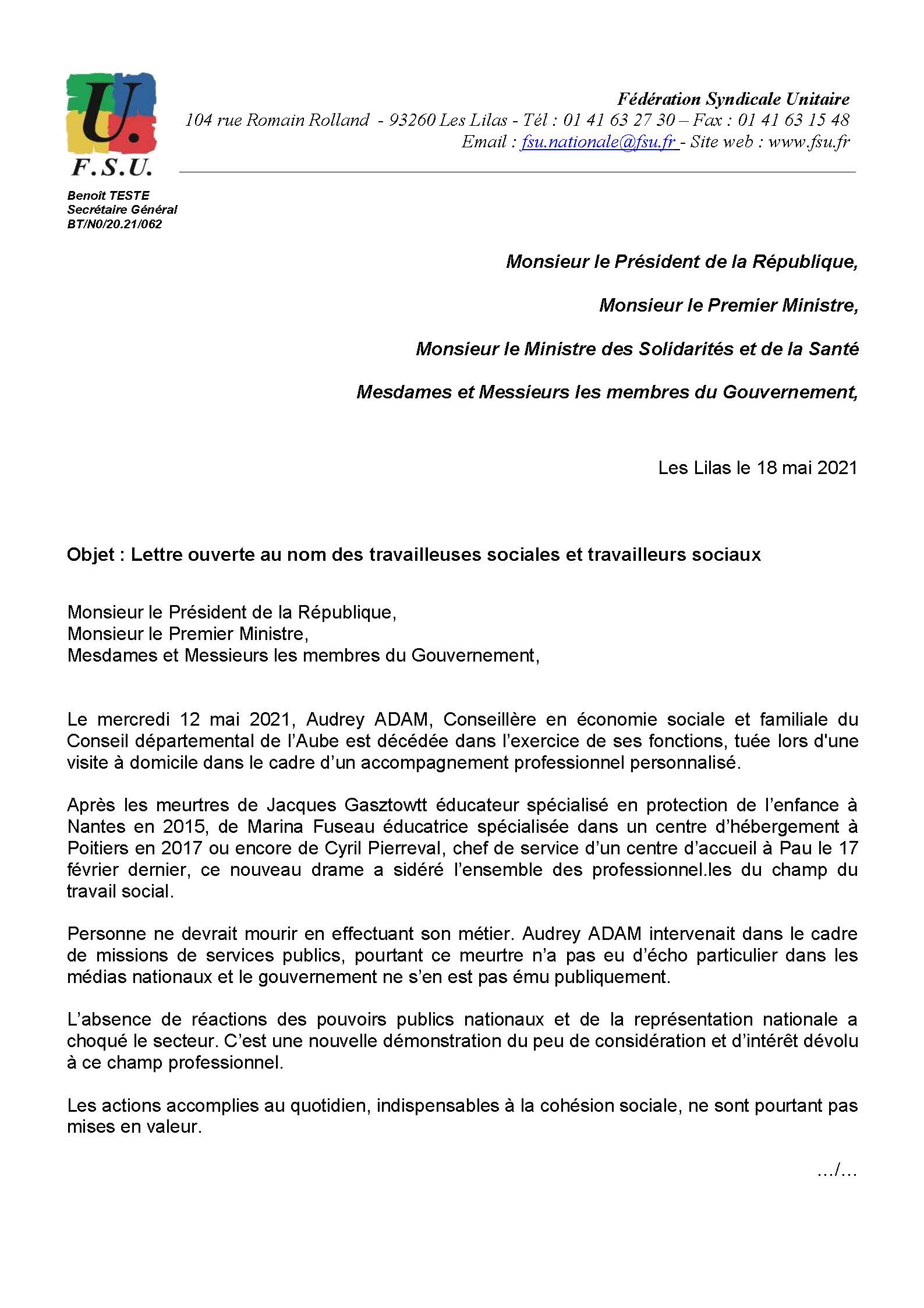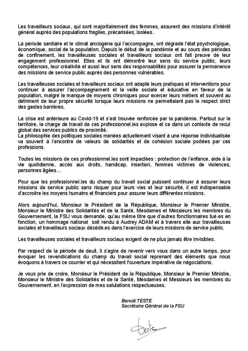 Courrier envoyé au Président de la République et aux membres du gouvernement à la suite de notre communiqué de presse d’hier suite au décès en service d’une conseillère en économie sociale et familiale. Les camarades siégeant pour la FSU au Haut Conseil du Travail Social, instance de concertation placée auprès du ministère de la santé, y sont intervenus pour exiger qu’à minima un hommage institutionnel lui soit rendu. Il s’agit d’une affaire qui secoue beaucoup les travailleuses sociales et travailleurs sociaux mais qui est ignorée par le gouvernement et ne perce pas le mur médiatique, signe de mépris contre lequel la FSU doit s’élever de toutes ses forces.