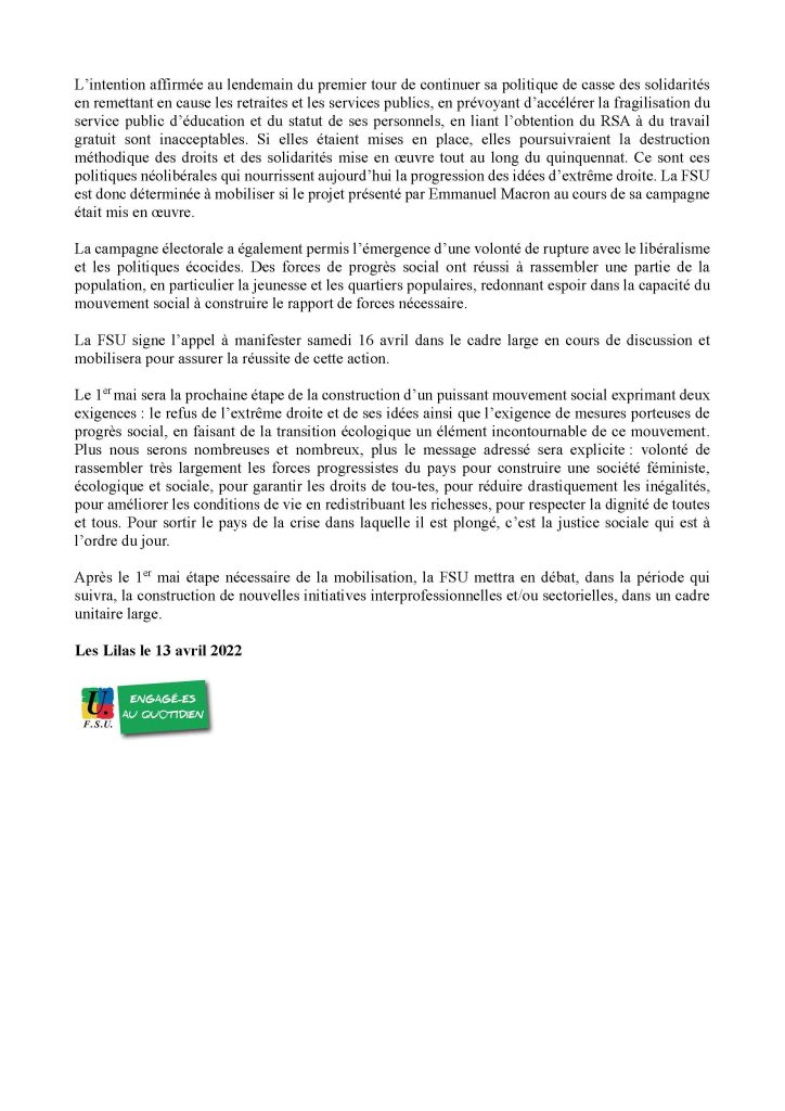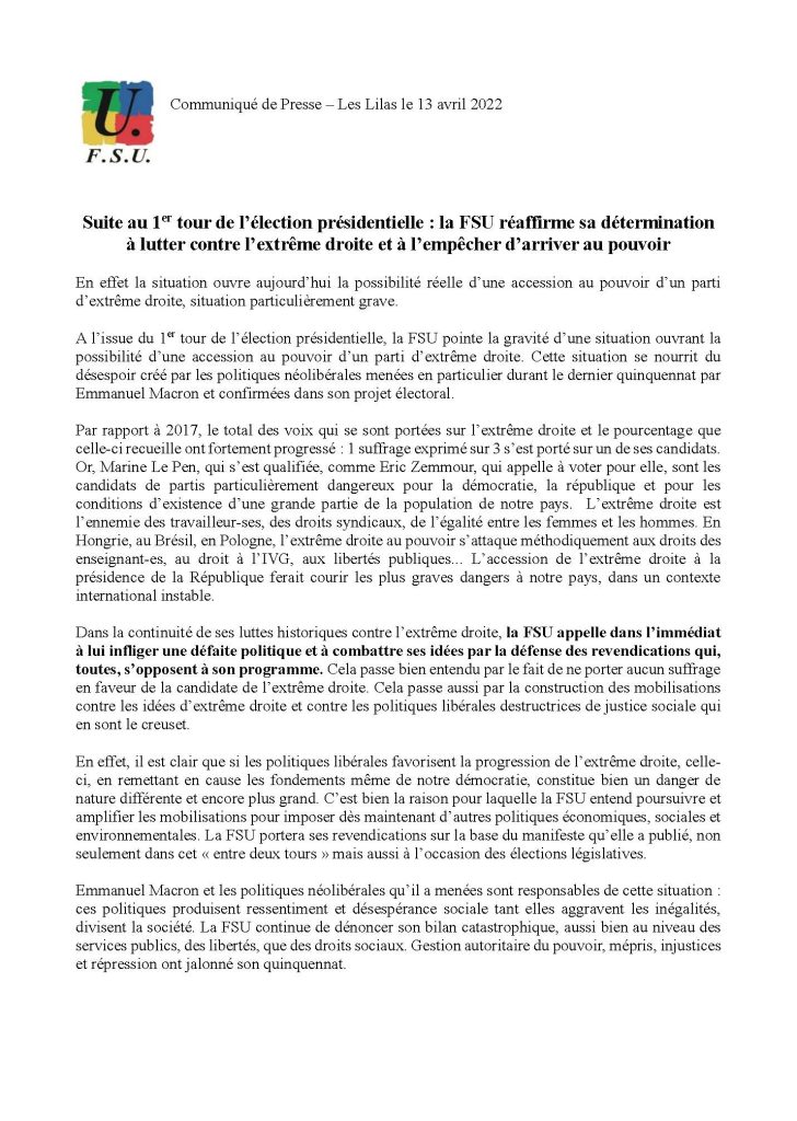 communique_fsu_suite_1er_tour_election_presidentielleTélécharger le communiqué : https://lafsuterritoriale87.fr/wp-content/uploads/2022/04/communique_fsu_suite_1er_tour_election_presidentielle.pdf