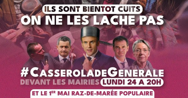 Poursuivons et amplifions la mobilisation ! Nous appelons à une casserolade générale le soir du 24 avril, un an après la réélection d’Emmanuel Macron, avant un raz-de-marée populaire pour un premier mai qui s’annonce historique.