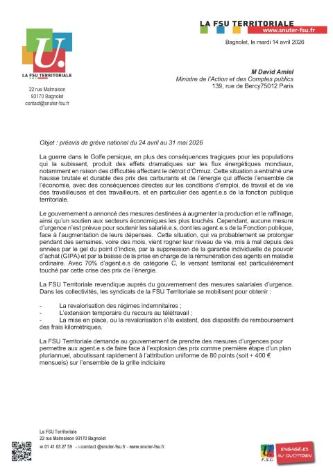 COMMUNIQUE DE PRESSEParis, le 13 avril 2026Groupe de travail rémunération du 13 avril 2026Les organisations syndicales représentatives de la fonction publique ont claqué la porte. Face à un ministre de l’Action et des comptes publics, David Amiel qui annonce engager… Lire la suite Communiqué de presse de l’intersyndicale nationale du 13 avril 2026