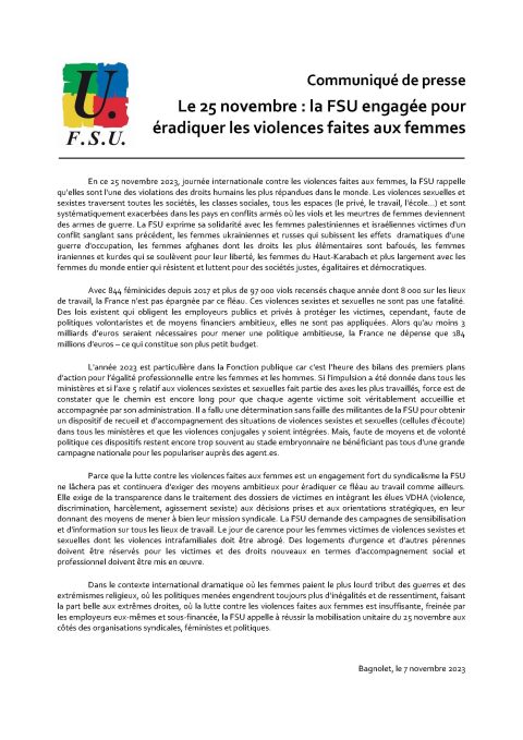 Communiqué de presse 25 novembre : la FSU engagée pour éradiquer les violences faites aux femmes