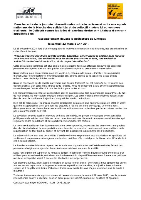 Journée internationale contre le racisme : Préfecture de LIMOGES le samedi 22 mars à 14h30