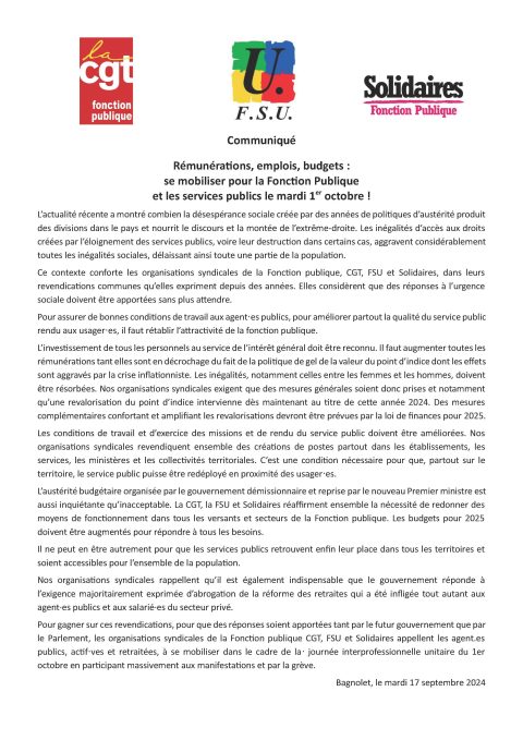 Communiqué de presse : Appel intersyndical Fonction publique 1er octobre