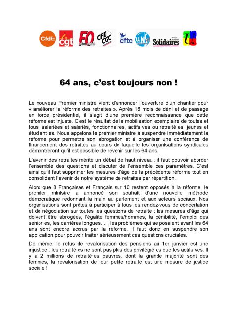 Expression intersyndicale sur les retraites : 64 ans, c’est toujours non !