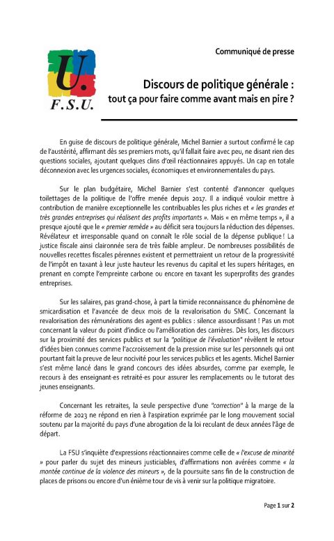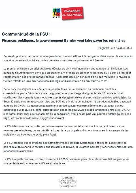 Communiqué de la FSU : Finances publiques, le gouvernement Barnier veut faire payer les retraité·es