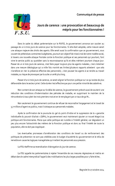 Communiqué de presse : Jours de carence, une provocation et beaucoup de mépris pour les fonctionnaires !