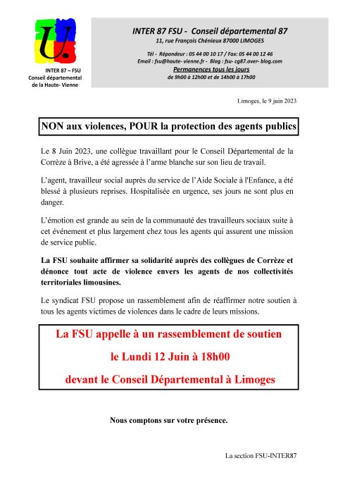 La FSU appelle à un rassemblement de soutien le Lundi 12 Juin à 18h00 devant le Conseil Départemental à Limoges.