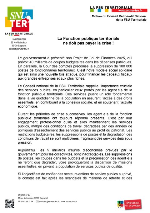 Délibératif National de la FSU Territoriale appelle l’ensemble des agent.es