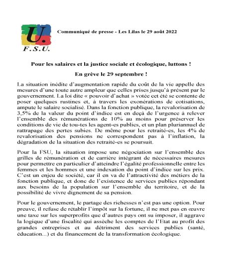 Communiqué FSU : Pour les salaires et la justice sociale et écologique, luttons ! En grève le 29 septembre !