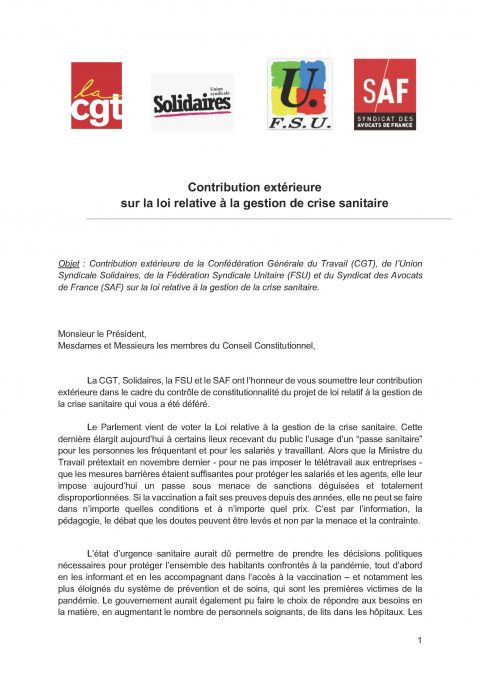 CGT-FSU-SOLIDAIRES-SAF : Contribution extérieure sur la loi relative à la gestion de crise sanitaire