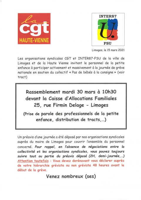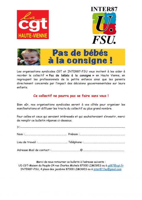 Les organisations syndicales CGT et INTER87-FSU vous invitent à les aider à recréer le collectif « Pas de bébés à la consigne » en Haute Vienne, en regroupant les professionnels de la petite enfance ainsi que les parents directement concernés par l’impact… Lire la suite « Pas de bébés à la consigne ! »: Bulletin d’inscription