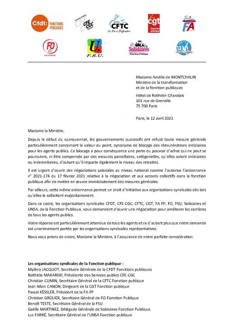 courrier demandant l’ouverture de négociations sur les carrières et les salaires dans la Fonction publique
