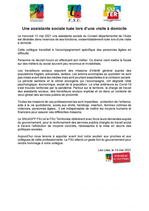 Le mercredi 12 mai 2021 une assistante sociale du Conseil départemental de l’Aube est décédée dans l’exercice de ses fonctions, vraisemblablement tuée lors d’une visite à domicile. Cette collègue travaillait à l’accompagnement spécifique des personnes âgées en difficulté. Personne ne… Lire la suite Une assistante sociale tuée lors d’une visite à domicile
