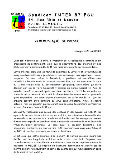 COMMUNIQUÉ DE PRESSE INTER87-FSU « DÉCONFINEMENT »