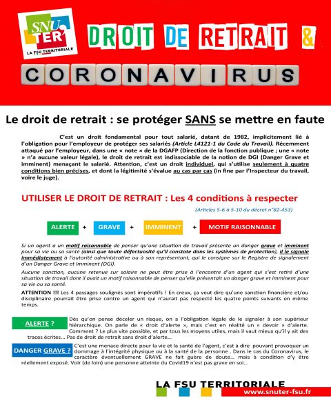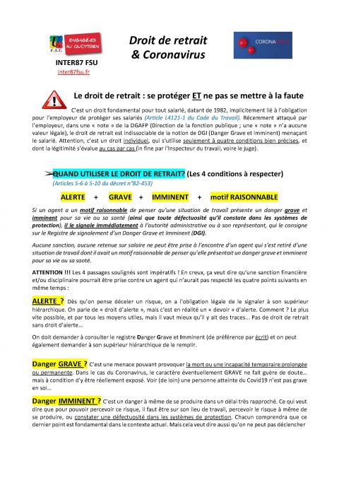 Si vous pensez que votre situation relève du droit de retrait (lire le document ci-dessous), vous devez impérativement prévenir : votre chef de service la médecine professionnelle un membre du CHSCT dont vous dépendez Nous vous conseillons, bien sûr, de… Lire la suite Droit de retrait & Coronavirus