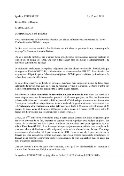 Syndicat INTER87 FSU Le 15 avril 202044, rue Rhin et Danube87 280 LIMOGES COMMUNIQUE DE PRESSE Nous venons d’être informés de la situation des élèves infirmiers en 3eme année de l’école d’infirmières du CHU de Limoges.En lien avec la crise… Lire la suite COMMUNIQUE DE PRESSE INFIRMIER-E-S INTER87-FSU
